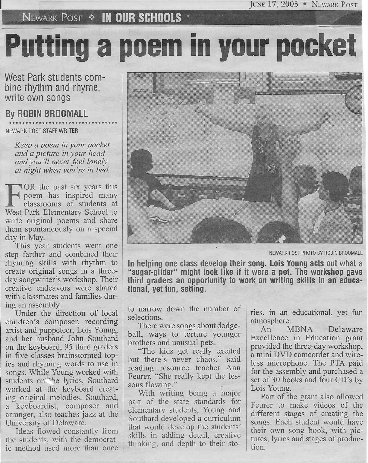 Putting a poem in your pocketby Robin Broomall, The Newark Post, June 17, 2005.
